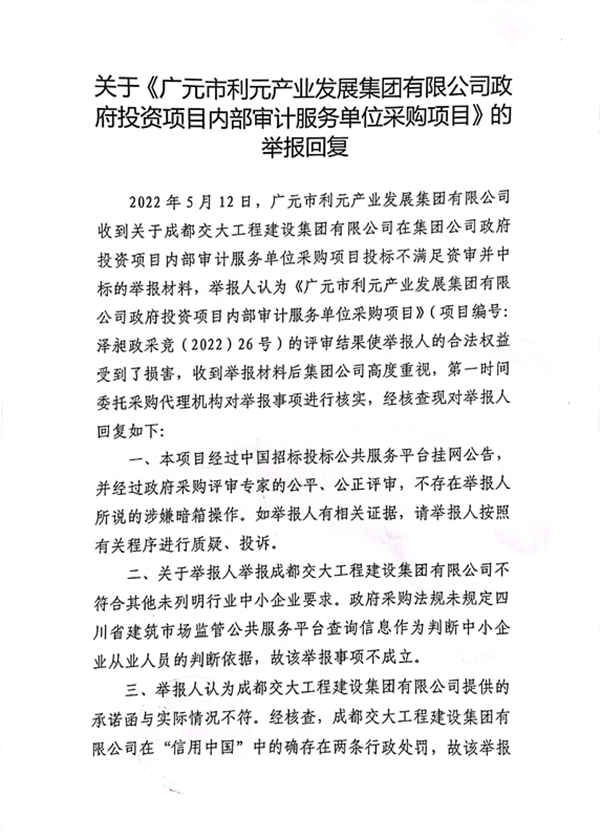 关于《广元市利元产业发展集团有限公司 政府投资项目内部审计服务单位采购项目》的举报回复