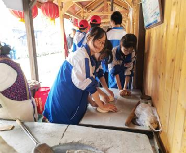 “近月湖”之旅结束后,随即打卡下一站罗家老街。在这里,同学们不仅能欣赏当地特色的民俗文化和美景,还能现场体验制作火烧馍,提高自主创新动手能力的同时,切实提升“自己动手、丰衣足食”的成就感。