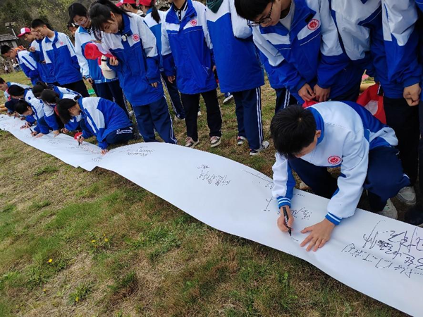 此次研学之旅在月坝“近月湖”拉开帷幕。同学们踏着欢快的步伐徒步到广阔无垠的草坪,走近大自然感受山清水秀的“有氧之行”。为了增加同学们对月坝的了解,工作人员先是对月坝进行了详细的讲解,接着请主持人现场命题,师生踊跃参与抢答,现场气氛紧张且活跃。最后,同学们畅所欲言,表达对未来的祝福与感想,并在卷轴上写下自己的“青春与梦想”。